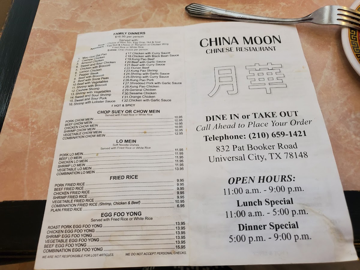 Welcome to China Moon Chinese Restaurant, nestled in the heart of Universal City, TX. This cozy eatery, located at 832 Pat Booker Rd, is well-loved for its diverse and flavorful menu, making it a favorite stop for both locals and travelers.